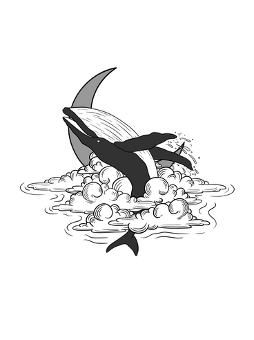 A whale breaching the clouds with the moon glowing from behind. A color and a monochromatic version are shown.