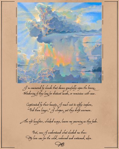 An poem written about my abnormal love of clouds. It was later edited (with help) and typed up in several different visuals. *Photos 2 and 4 are not my own cloud art*